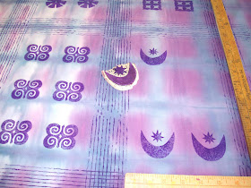 I have been working on two commissioned adinkra cloths this week, and just finished the first one. For those who are not familiar with adinkra, it is a technique that originated in Ghana, in which symbols are stamped on the cloth in a grid pattern. Adinkra cloth was originally used for funerals, but has become a prominent part of Ghanaian culture.